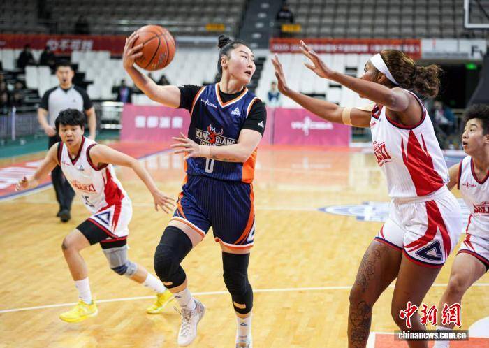 新疆女篮武桐桐(蓝衣)持球进攻。新疆天山女篮俱乐部供图