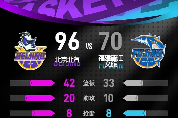 第四节,北京北汽保持强势,牢牢掌控比赛节奏,福建晋江文旅缺乏有效反击的机会。此时,北京北汽的姜文持续发力,为球队贡献了10分,其中包括1记三分球。最终,北京北汽以96-70的比分赢下比赛,展现了他们的强大实力。