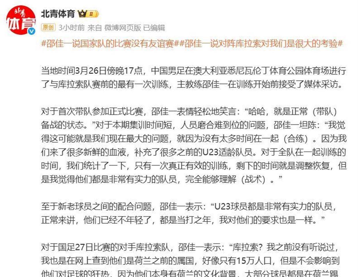 邵佳一在去年11月接替扬科维奇成为国足主帅,此前他只带队打过两场封闭热身赛,分别战平了莫斯科斯巴达和乌兹别克斯坦。 所以,这场对阵库拉索的比赛,实际上就是邵佳一在公众面前的第一次大考。